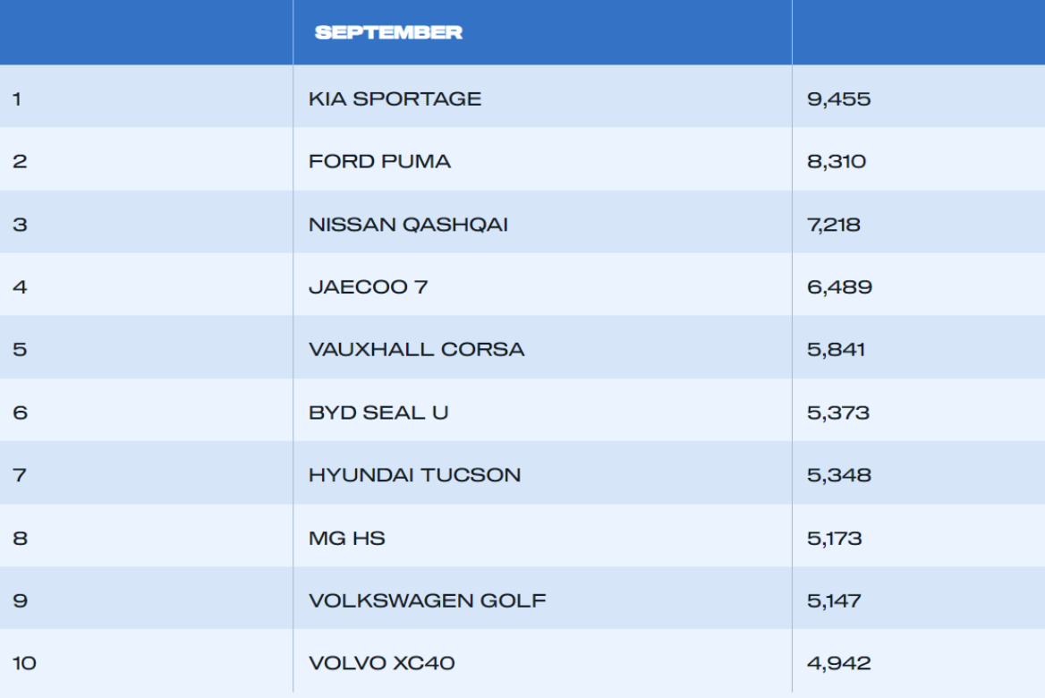 Chery Automobile’s Jaecoo7 ranked fourth by sales in the UK with 6,489, while BYD’s Seal U took sixth spot with 5,373 and MG’s HS took eighth place with 5,173.