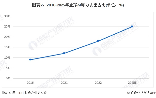according to the data of the 2022-2023 global computing power index evaluation report, from the perspective of 15 major countries in the world, the proportion of AI computing power expenditure in total computing power expenditure increased from 9% in 2016 to 12% in 2021, with preliminary accounting accounting for 18% in 2022 and expected to reach 25% by 2025.
