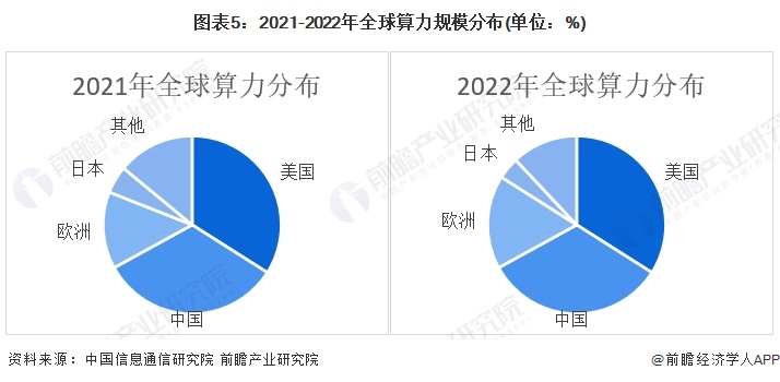 In terms of the distribution of global computing power, according to the China Institute of Information and Communications, the shares of the United States, China, Europe and Japan in the global computing power scale will be 34%, 33%, 14% and 5%, respectively, in 2021. Among them, the global basic computing competition to the United States and China as the first echelon, and the gap between China and the United States is narrowing.
