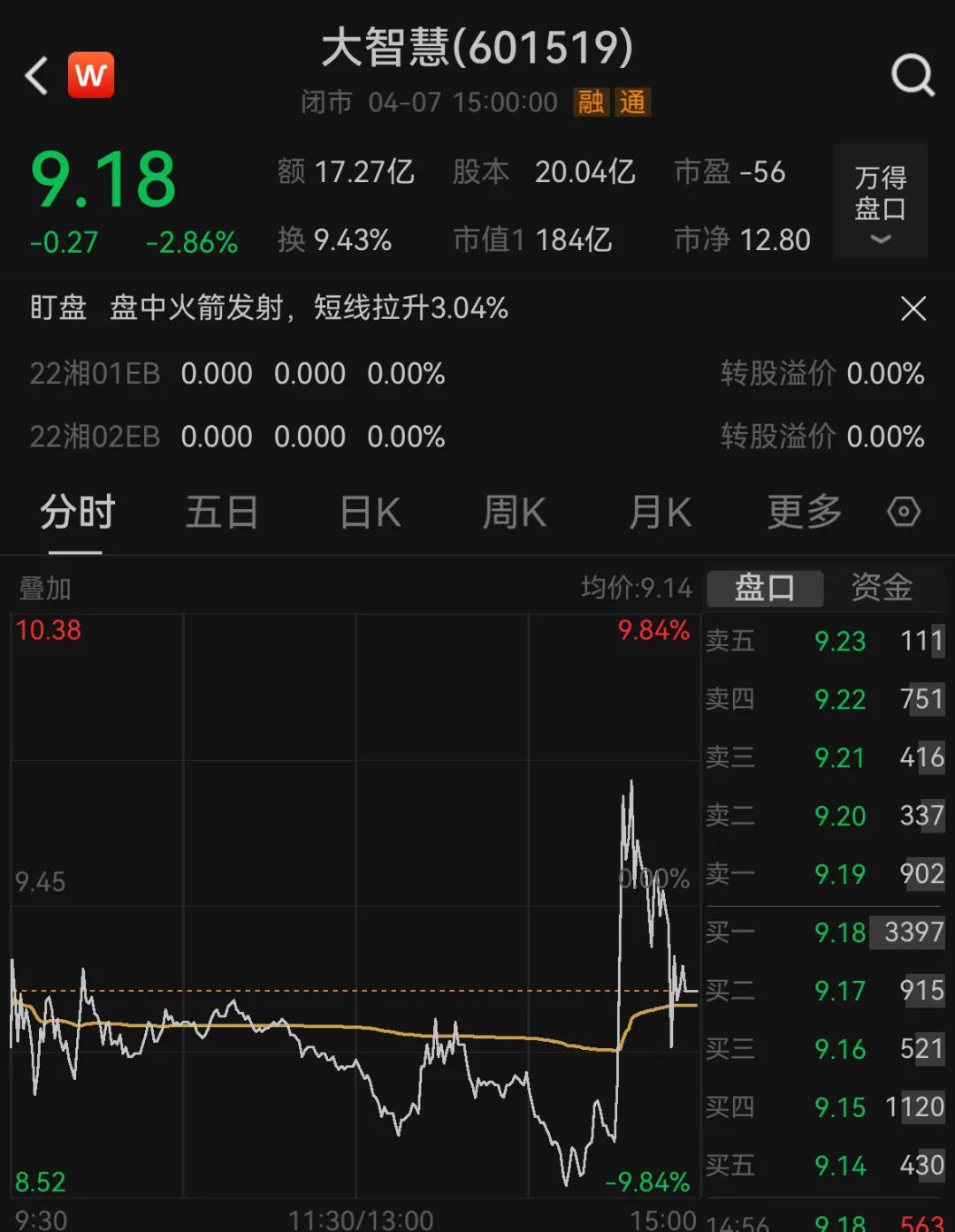 Great wisdom intraday shock, which was once close to the fall limit.