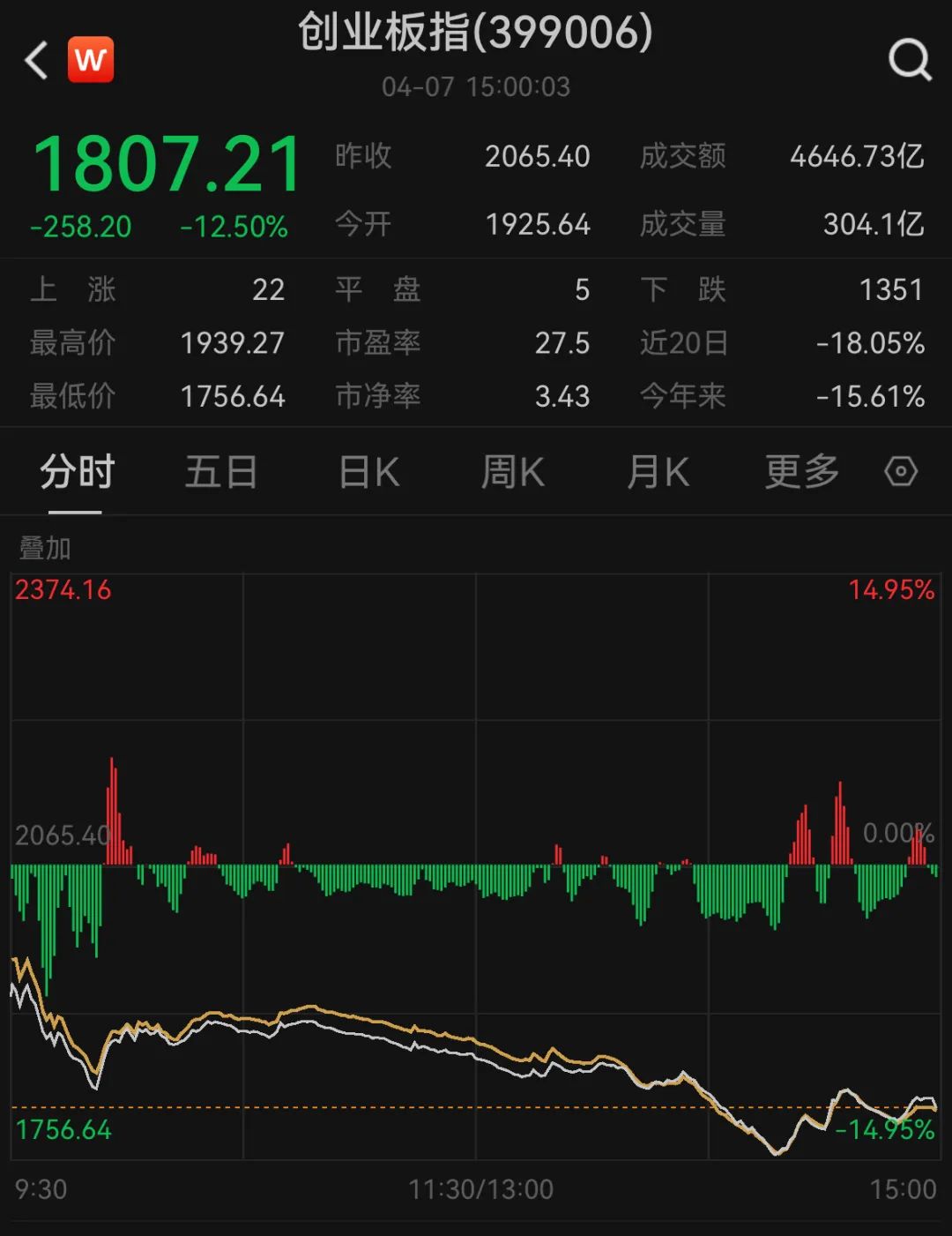 The ChiNext index closed down 12.5%, the largest one-day decline in history, and the largest intraday decline of nearly 15%.